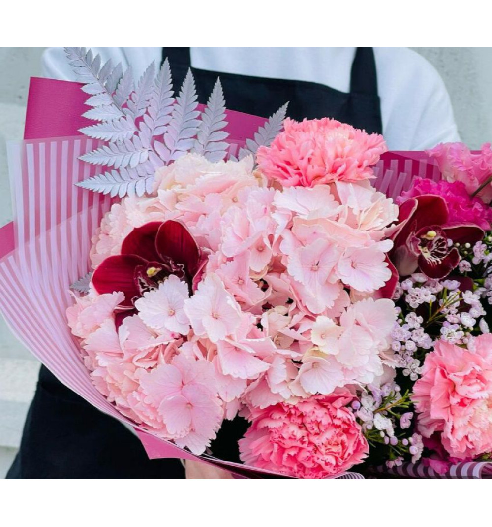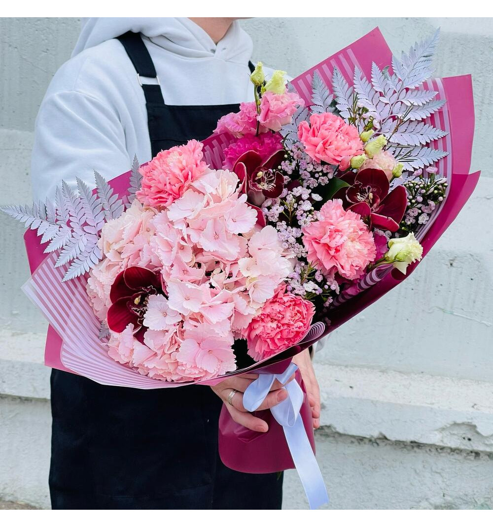 Букет с орхидеей и эустомой — это изящное сочетание природной изысканности и прекрасной грации. Орхидеи цимбидиума добавляют величественности и роскоши, а нежные розовые эустомы приносят нотки романтики и нежности. С гармоничным дополнением папоротника, рускуса, гортензии, диантуса и гипсофилы, этот букет становится полным воплощением изящества и красоты природы. "Орхидея и эустома" — идеальный выбор для особых случаев, чтобы подарить вашим близким волшебный момент и запоминающийся опыт.