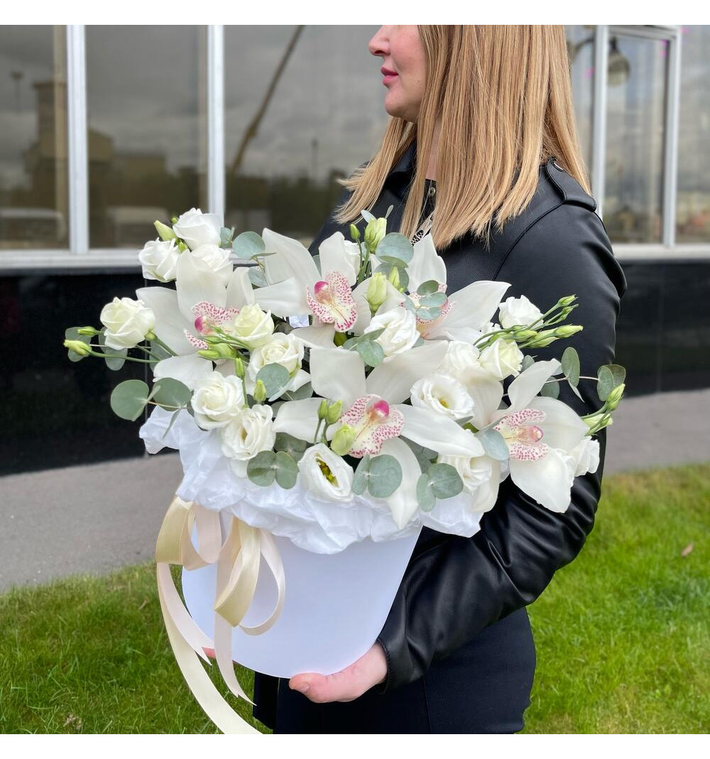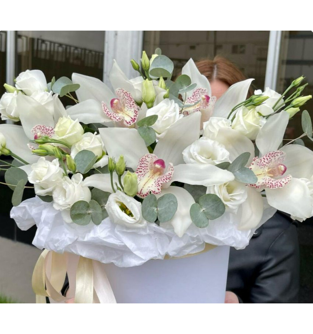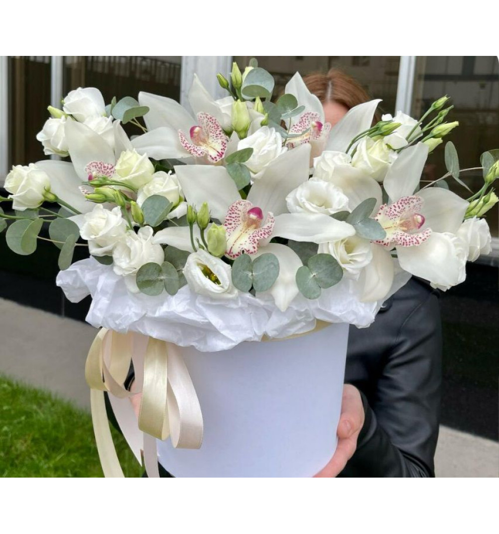 Купить Орхидея белая с эустомой в коробочке в Макинске за 25 000 ₸ | интернет-магазин «Guls»
